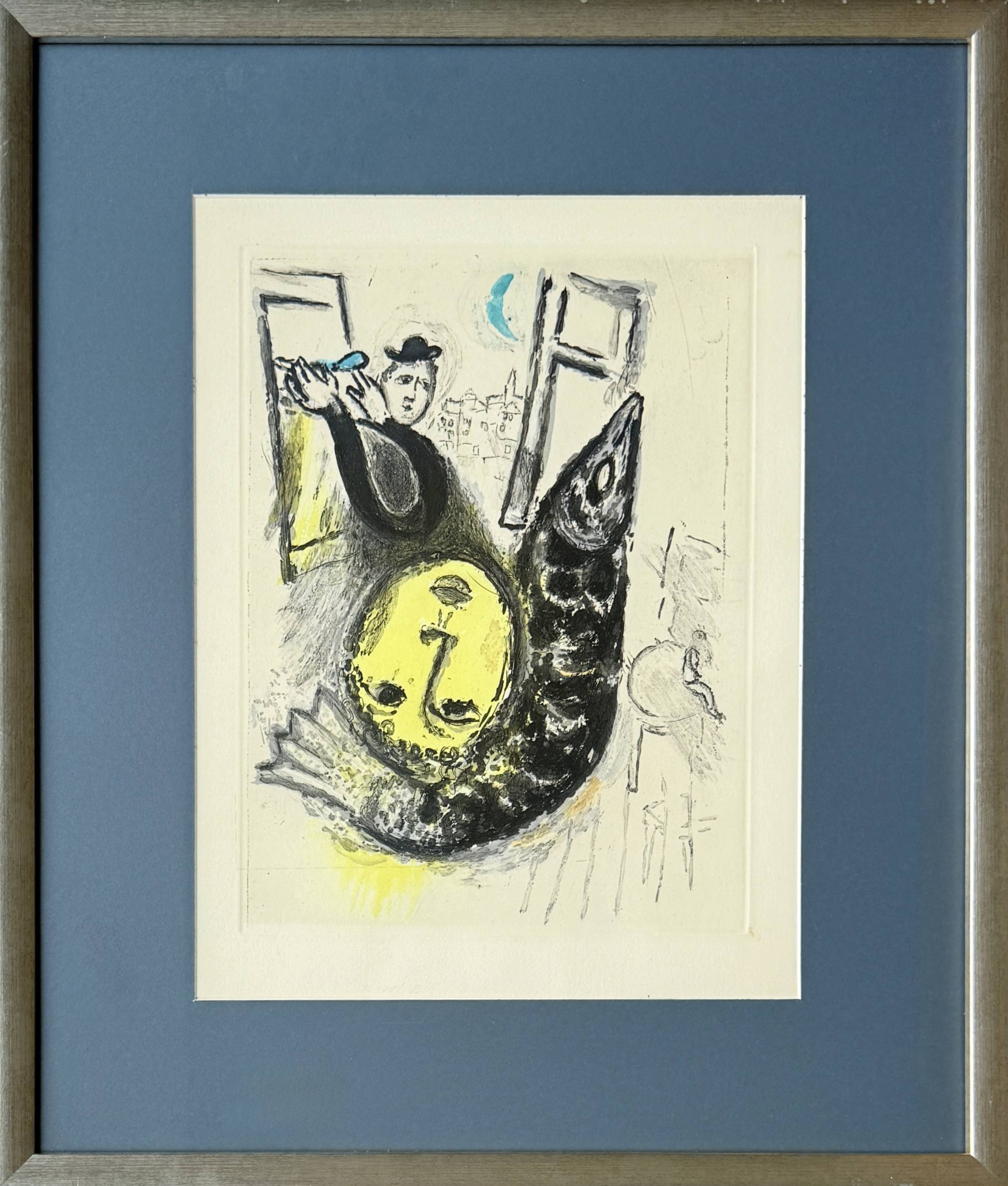 This original color etching comes from De Mauvais Sujets (“The Bad Subjects”), a 1958 illustrated portfolio that paired Marc Chagall’s artwork with texts by French writer Jean Paulhan. The series brings together Paulhan’s sharp wit and Chagall’s imaginative visuals, creating a mix of humor, satire, and poetry in both word and image.